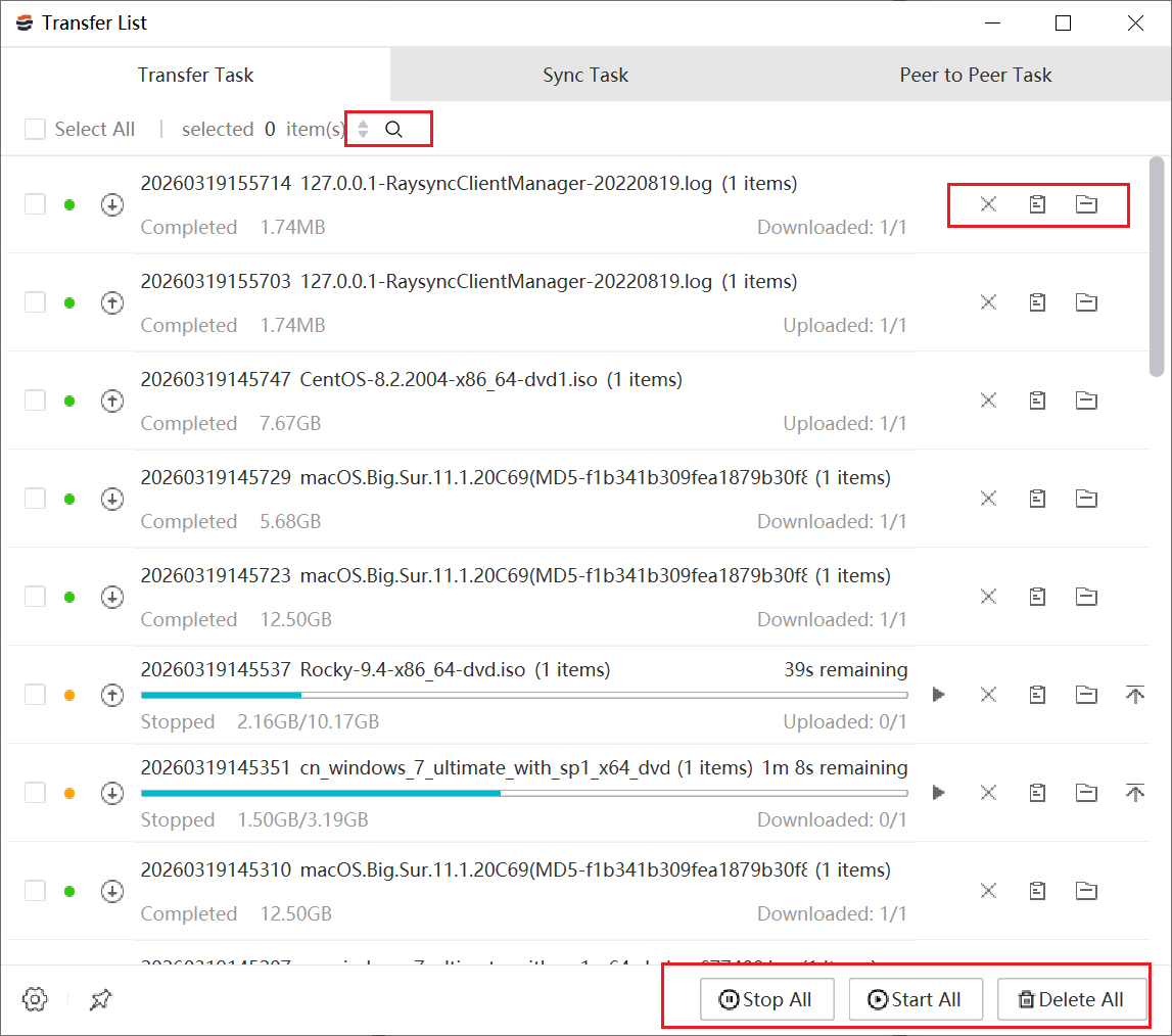 The transfer list includes three types of tasks: General task transfer tasks, Sync tasks, and Peer to Peer tasks.