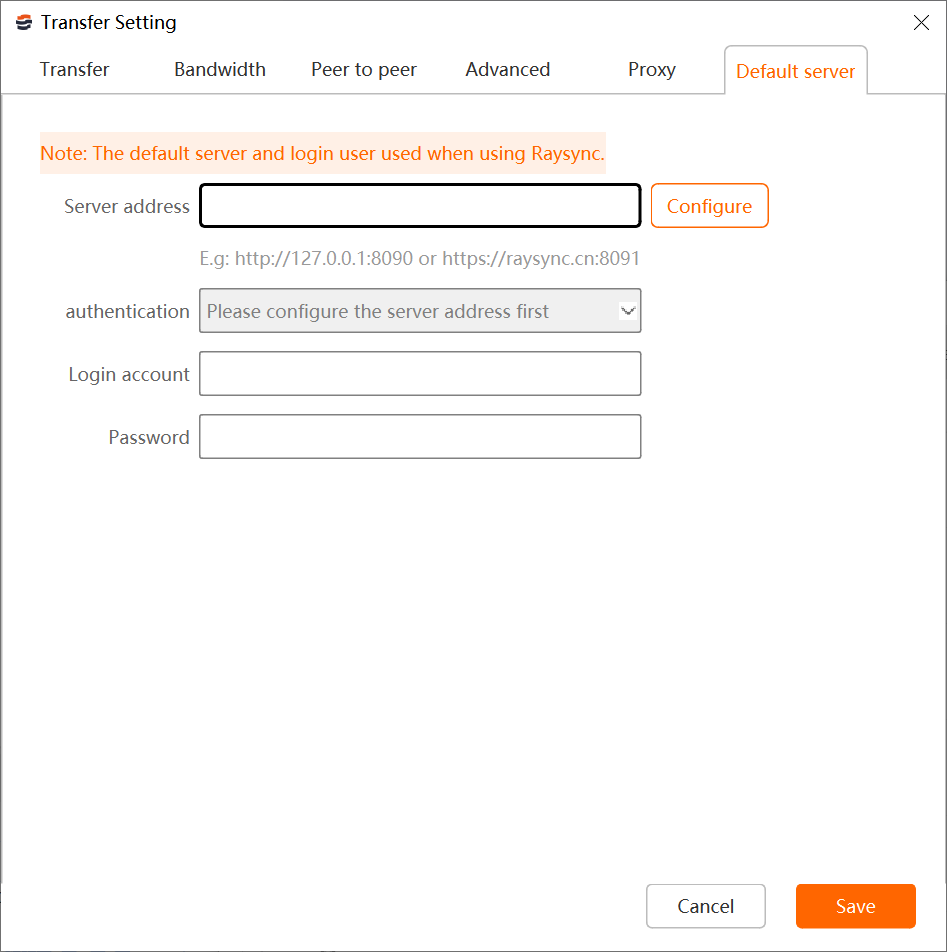 Right click the client icon in the client to be transmitted, click [Settings] - [Default server], and enter the default server IP address (the server address to create the task), login account and password.