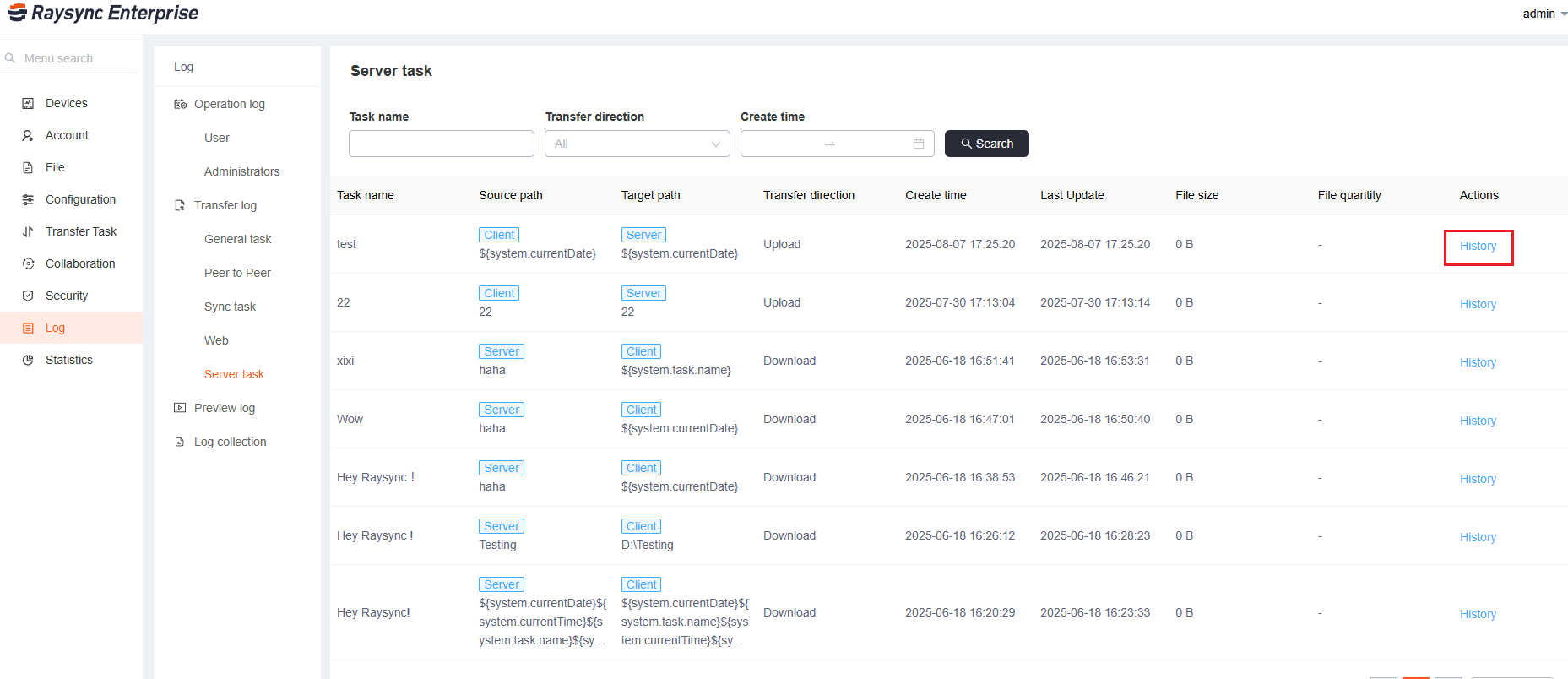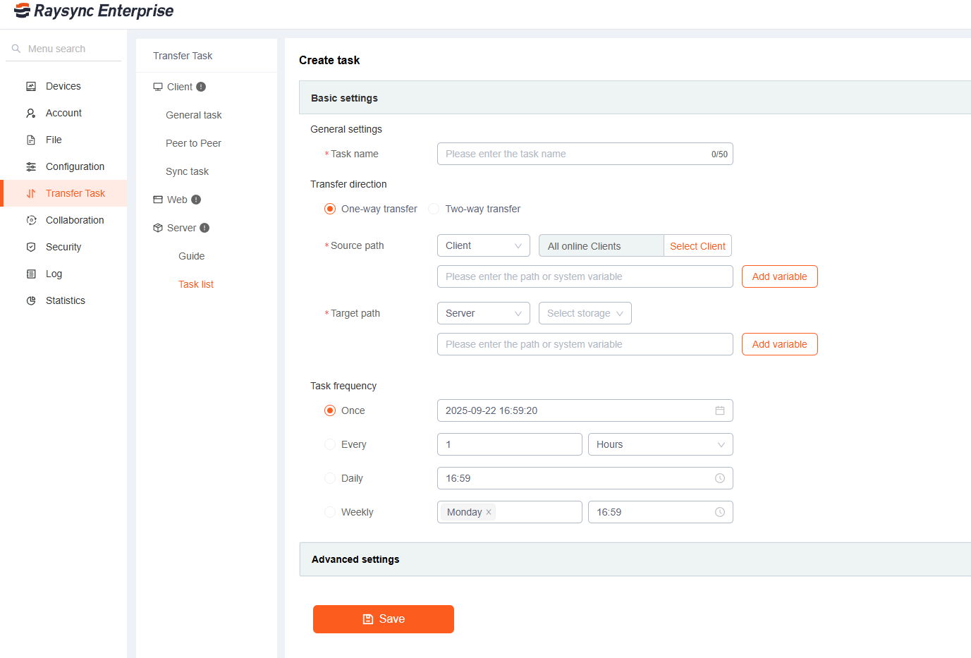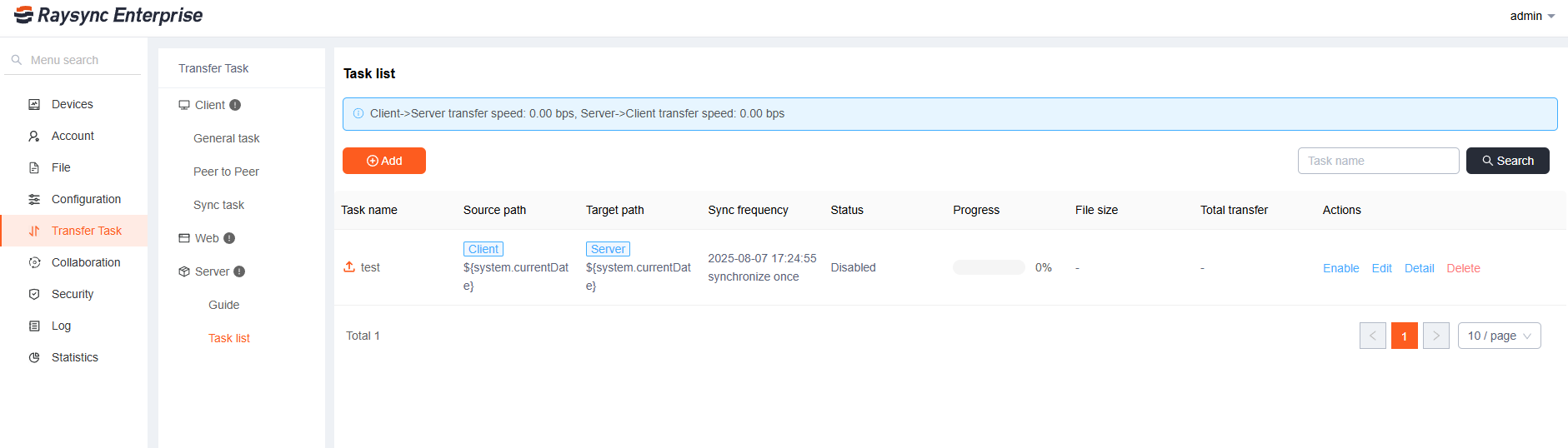 Click [Transfer Tasks]-Server[Task list]-[Add] on the Admin portal,and fill in the task name, source path, and target path, select the synchronization frequency, and click Save to create it successfully.