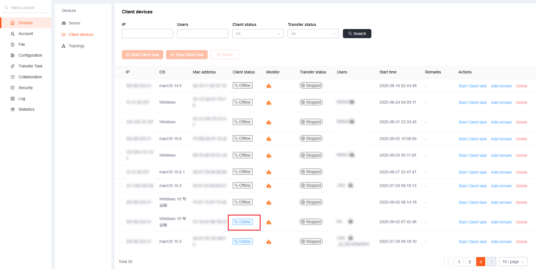 Check whether the client connects to the service successfully. Click [Devices] - [Client devices] to check whether the node machine status is normal. Only the client node machine status is [Online], the transmission task issued by the server can be executed normally.