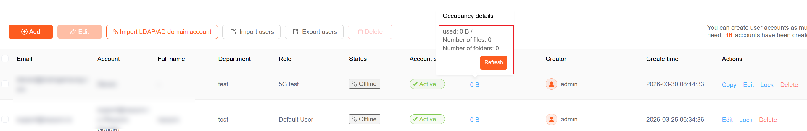 Navigate to the user list and click on the Occupation to view their current storage usage. Click the "Refresh" button to update the storage information.